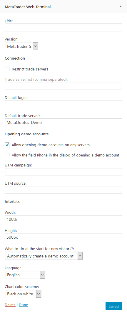 The website the plugin is located at has no access to the platform data, including information entered during login and demo account opening. User data are securely protected and cannot be accessed even by the owner of the website the web terminal is used on.