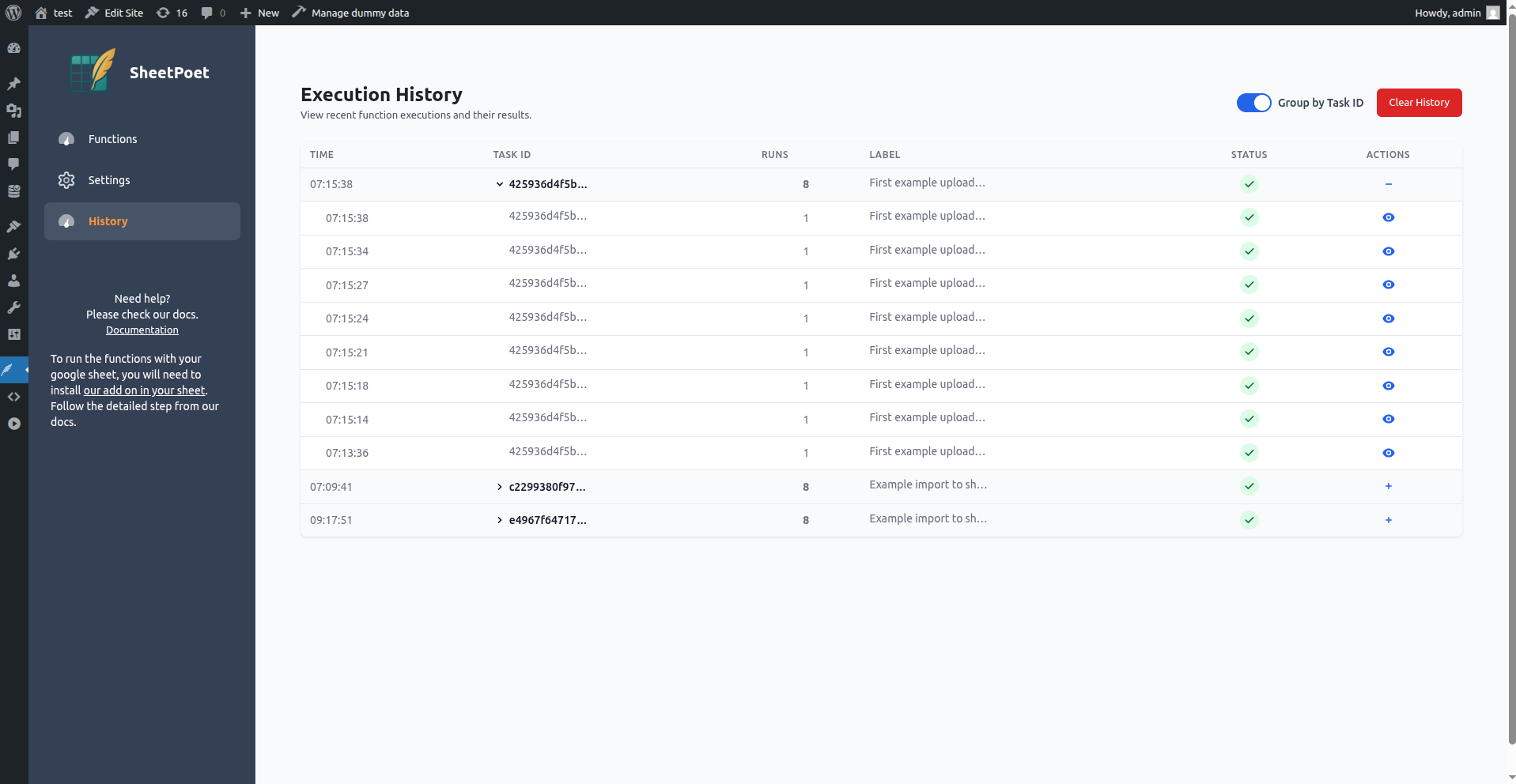SheetPoet is a powerful WordPress plugin that works hand-in-hand with its companion Google Sheets Add-on. It enables you to create and manage secure PHP functions via the WordPress admin and trigger them directly from your spreadsheet. You can import data from WordPress into Sheets, send spreadsheet data to your site, or run one-time custom logic.