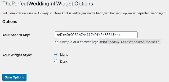 - Bezoek in WordPress: ‘Instellingen > ThePerfectWedding.nl Widget opties’ (/wp-admin/options-general.php?page=TPWWidget) en plak uw unieke sleutel in het daarvoor bestemde veld
