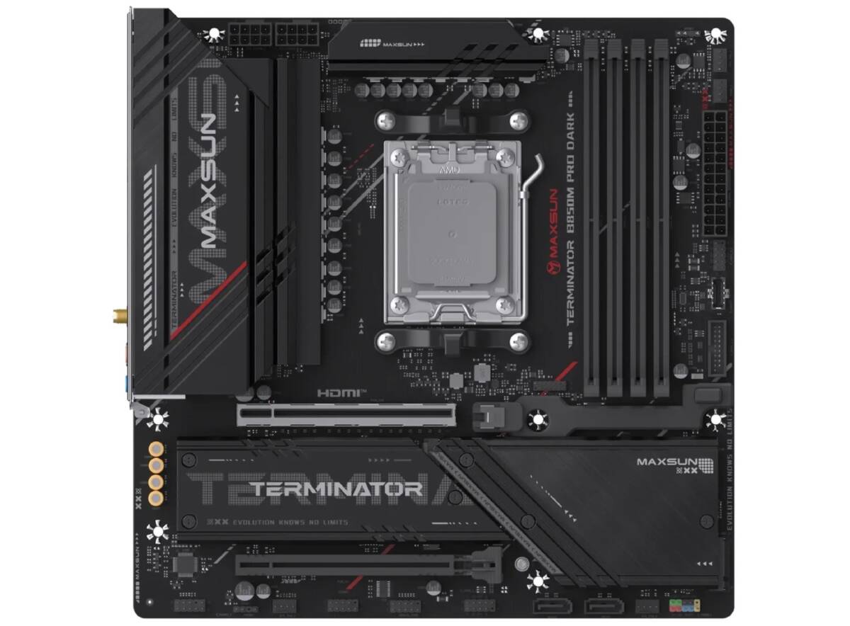 Maxsun MS-Terminator B850M Pro Dark WiFi — материнська плата з 8-шаровим текстолітом і 12+2+1-фазним живленням VRM для процесорних ядер, інтегрованої відеокарти та пам’яті відповідно. Цифрові мосфети DrMOS з масивними радіаторами Mech Armor витримують до 300 Вт, а оперативка DDR5 розганяється до 8000 МГц. Ще один широкий радіатор накриває чипсет і три слоти для SSD M.2, два з яких ультрашвидкісні PCIe 5.0. Аналогічну шину підтримує слот x16, який армований металом і оснащений кнопкою EZ Latch для спрощення демонтажу відеокарти.