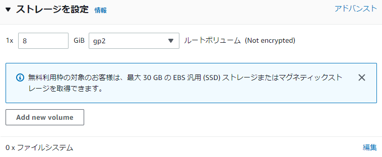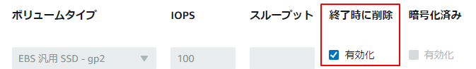 5.「終了時に削除」の有効化にチェックを入れるとEC2削除時にEBSも削除します。