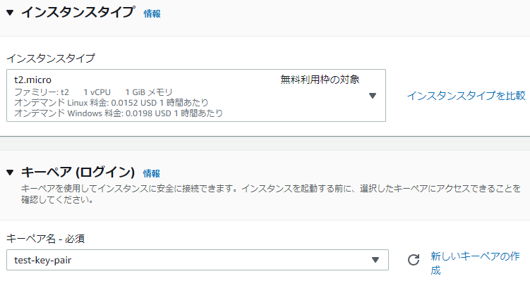 5.インスタンスタイプとキーペアを指定します。元のEC2の値を確認して入力します。