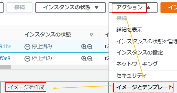 3.「アクション」>「イメージとテンプレート」>「イメージを作成」をクリックします。