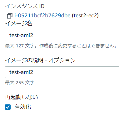 「再起動しない」は有効化にチェックを入れます。AMI作成時に再起動しなくなります。