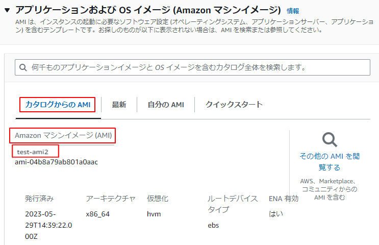 方法1.「カタログからのAMI」タブのAMIの箇所が対象のものであることを確認します。そのままで大丈夫です。