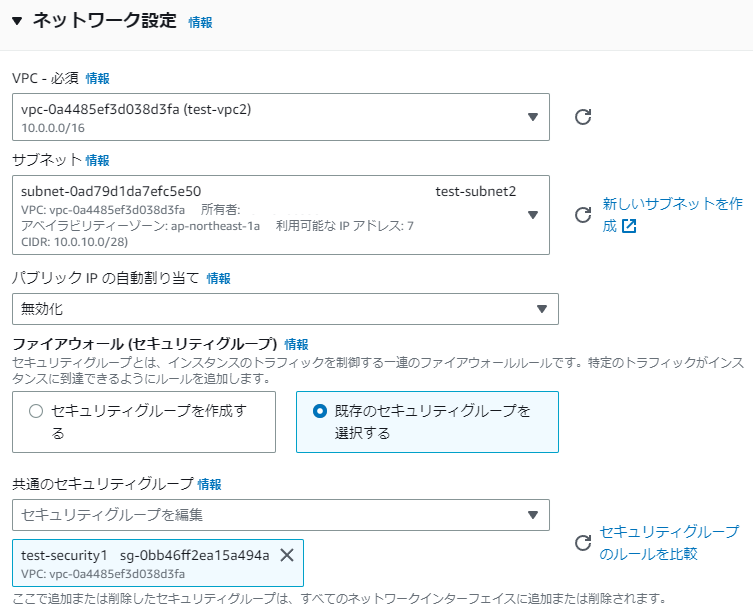 7.VPC、サブネット、パブリックIPの自動割り当て、セキュリティグループを選択します。