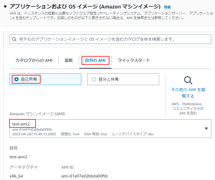 方法2.「自分のAMI」タグを選択し、「自己所有」をチェックし作成したAMIを選択します。
