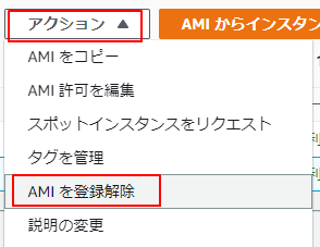 3.AMIの一覧で削除するAMIを選択してアクションから「AMIを登録解除」をクリックします。