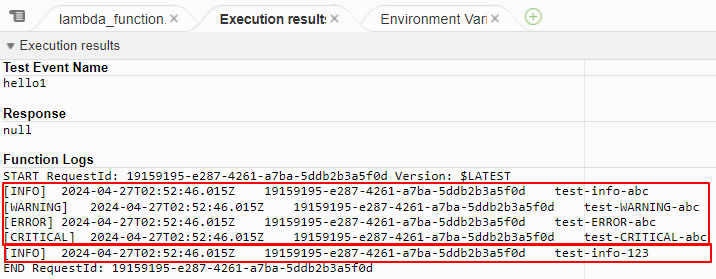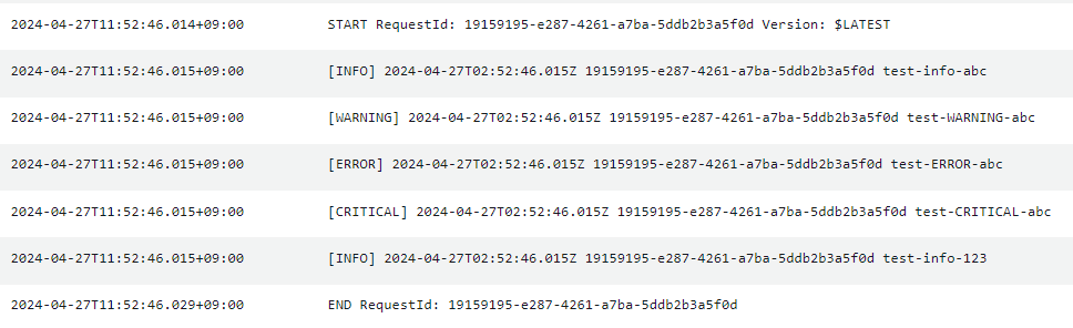 7行目は出力するログの最低レベルをinfoにしています。info以上のログが出力され、infoより下のdebugは出力されません。