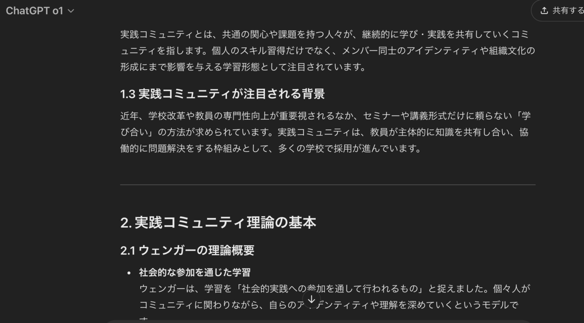 3、その調査結果をGPTo1に読み込ませて考察してもらった上で、教師がこれを参照して実践コミュニティをつくるためのガイドをつくってもらう。