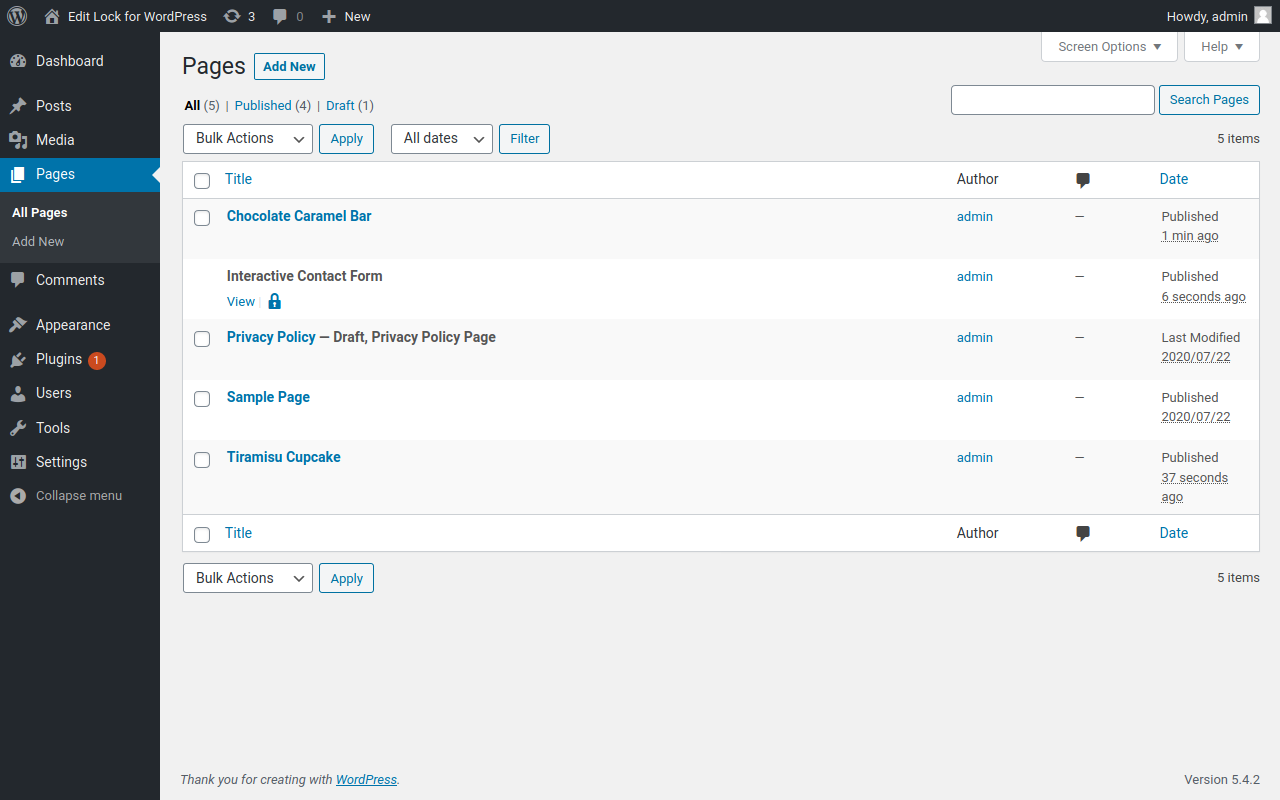 Page listing on WP-Admin showing a locked page.