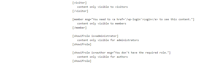 To use you need to create the content and wrap it with these shortcodes: [visitor], [member] or [showifrole].