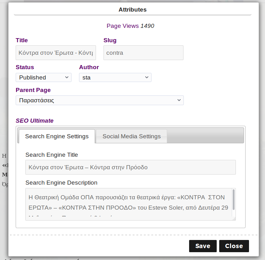 The plugin provides built in support for setting and editing: title, content in wysiwyg editor, post image, url slug, post status, author, parent page, categories and, if SEO Ultimate is installed, search engine title/description and social media title/description and image.