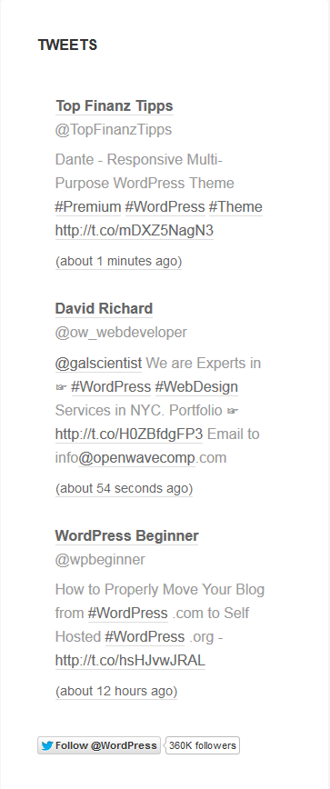There is also a widget to easily add a Twitter feed to your header, sidebar or footer, if your theme supports it.