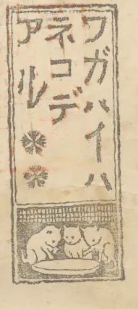 しかし、これは『猫』「上」にある全ての視覚的資料ではない。装幀デザインは、現在の用語で言ふと、ジャケット付きのものであり、五葉の絵がそれを飾るのである。ジャケットをとると、裸の本にも独特なデザインが見える。いづれも「猫」がモチーフになつてゐるもので、作品それ自体と深い関はりがあるといふよりは、明らかに『猫』の諷刺的な内容に合致してゐることがうかがへる。書物に入ると、五葉の口絵があり、そのすぐ次に扉がある。口絵にも扉にも作品名が書いてあり、口絵に「ワガハイハネコデアル」、扉に「吾輩ハ猫デアル」といふやうに表記されてゐる。更に、扉には「夏目漱石著」とあり、猫の顔が描かれてある。その次にあるのは序文で、ページをめくると中村不折の最初の挿絵がある。この挿絵は作品の主人公(?)たちを思はせるやうな内容から成り、ある男性が猫を尻尾から捕まへてゐるものである。そして、作品に入ると、「第一」の冒頭にカットが挿入され、「ワガハイハネコデアル」と書いてあり、三匹の仔猫が描かれてゐる。このやうに表紙から「第一」、作品が始まるまでの、さまざまな視覚的資料ができてゐる。