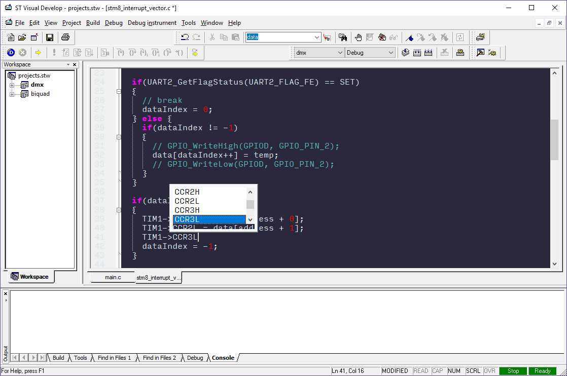 DMX-512 is a commonly-used lighting protocol for stage, club, and commercial lighting systems. Electrically, it uses RS-485; the protocol uses a long BREAK message at the beginning, followed by a “0” and then 511 bytes of data, transmitted at 250 kbaud. In this test, I’ll implement a DMX-512 receiver that directly drives a common-anode RGB LED. I will do this with whatever peripheral library or code-generator tool the manufacturer provides (if any at all).