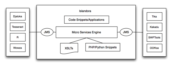 The Islandora code layer provides integration with numerous third-party software as direct plug-ins (eg. ImageMagick [6], FITS [7], LAME [8], Tesseract [9], Internet Archive Bookreader [10], Open Seadragon [11], etc.), or through the Islandora micro services engine [12]. This software can be called upon to create derivatives and perform data transformations or extraction for data that is then stored in the digital object repository layer, built using FedoraCommons [13] software.