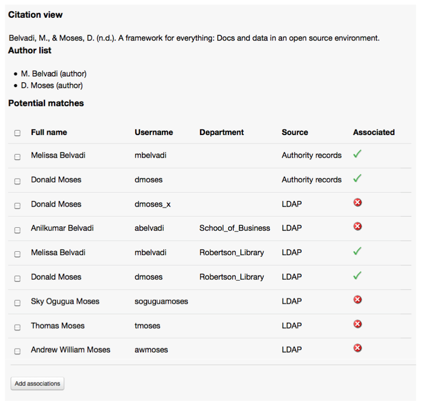 When logged in with the role of administrator, an Associate button is available for each citation. When selected it searches both the LDAP directory and existing researcher records in the repository, looking for likely name matches between the citation and researchers and displaying those records. This process highlights existing associations within LDAP and the repository and other possible associations. The results are then presented to the user (see Figure Five). Appropriate associations can then be selected and created by the administrator, and are written in RDF to the RELS-EXT datastream of the citation object.