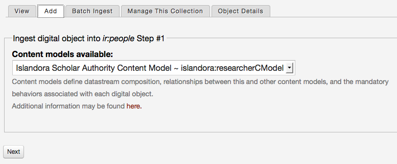 Occasionally the researcher record will not be available via the campus LDAP. In this case, to manually add a Researcher record, an authorized user navigates to the collection containing the researcher records, selects Add, selects the Authority content model and proceeds to the data entry form. Figures Six and Seven show a user’s view of how this process unfolds.
