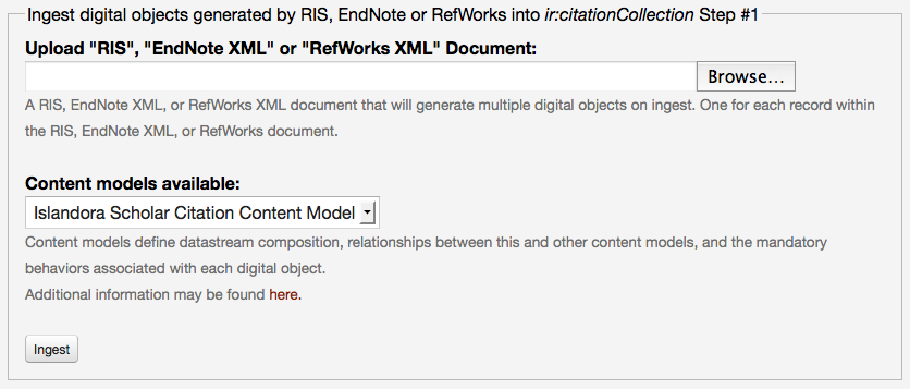IslandScholar leverages a number of different technologies to provide users with a choice of formats to be used when adding citations into the repository. The IslandScholar application currently supports the import of citations in RIS [30], Endnote XML [31], RefWorks XML, or MODS bibliographic formats. A RIS, EndNote XML, or RefWorks XML document can generate a single or multiple digital objects on ingest (One for each record within the RIS, EndNote XML, or RefWorks document uploaded to the repository). The Islandora 7 version of the Scholar solution-pack module (currently under development) provides additional support for single and batch ingest using unique identifiers such as digital object identifiers (DOIs) and PubMed IDs (PMIDs).
