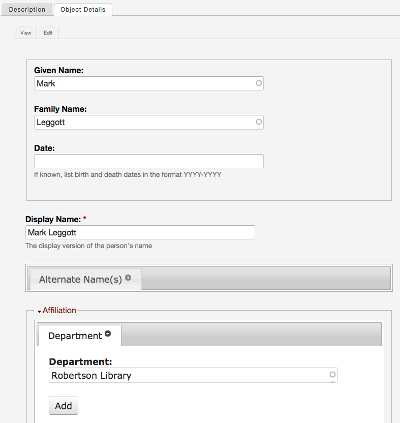 Researcher records can be created in a number of ways within the IslandScholar system: through an associated import from the University’s LDAP system, adding a user through Drupal’s Users module, or by using Islandora’s XML form/Ingest framework. Basic data about researchers is contained within the University’s LDAP system; with the Drupal LDAP Integration module [23] enabled and configured, we are able to pull data directly from the campus LDAP server.