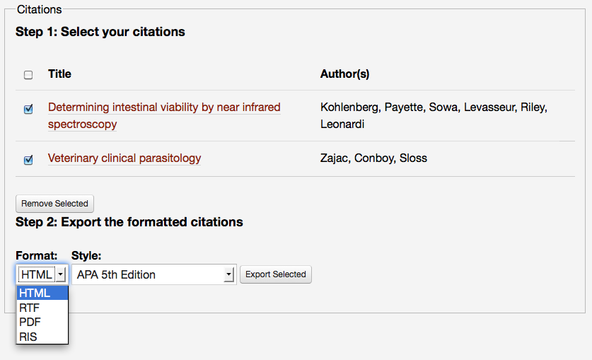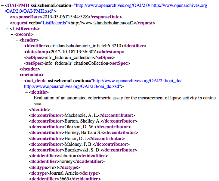 To generate formatted citations from the MODS metadata in IslandScholar, developers on the project first created php code [28] to convert the MODS metadata stored in IslandScholar into the CSL JSON format. To accomplish this task the code parses the MODS and outputs it in a format that conforms to CSL – for example, a “Journal Article” (a local genre term in the MODS metadata) is transformed to “article-journal” in the corresponding JSON. Names and dates are also reformatted so that they match CSL requirements. For many other fields XPATH queries of the MODS are used to populate CSL variables. The resulting CSL JSON is then handed to the citeproc-js [29] javascript module, the style is applied, and a formatted citation is the result.