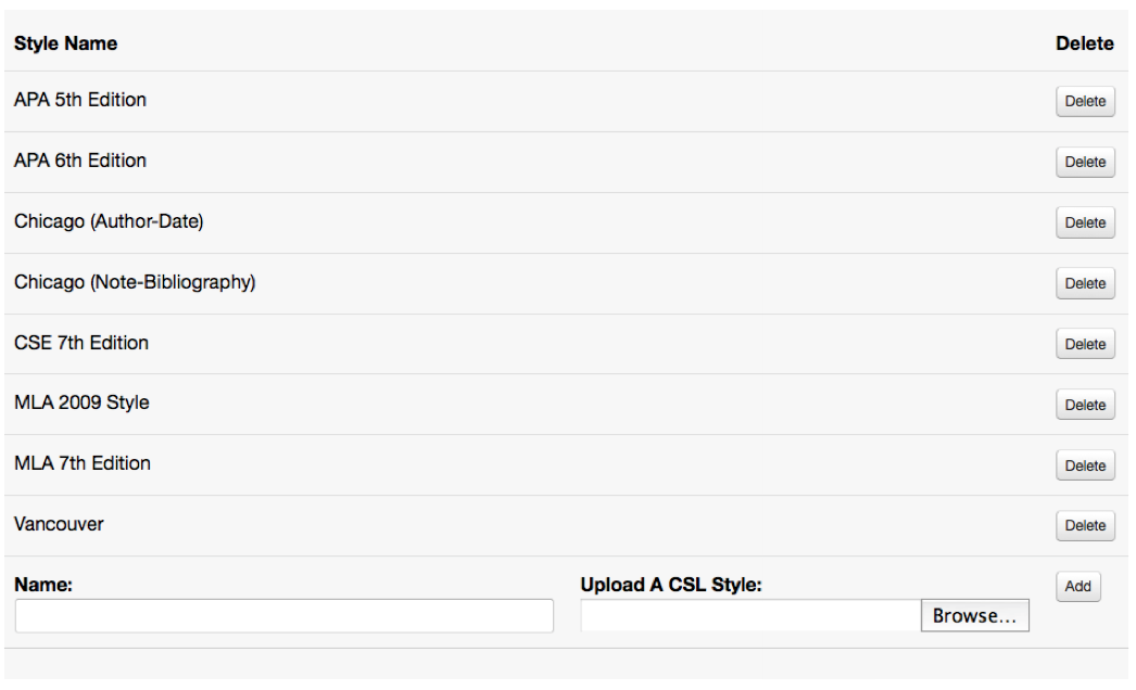 In the first version of IslandScholar, a pre-defined, generic citation display was created. To provide options for citation formats for both display and export, one of the goals of this version of IslandScholar was to integrate the Citation Style Language as a method to reliably generate citations formatted in particular styles. Citation Style Language (CSL) is “an open XML-based language to describe the formatting of citations and bibliographies.” [25] There is a large collection of community contributed styles [26] available for download and these styles can be added to and used by IslandScholar. Figure Eight (below) illustrates the styles already added to IslandScholar and the option for adding additional styles. A list of currently installed styles appears, and a user with the appropriate permissions can upload a new style, which then becomes available in the system.