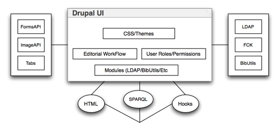A number of open source applications form the structure of the Islandora framework which can be extended by integrating additional applications to meet new requirements. The front-end/interface for Islandora is provided by the popular Content Management System, Drupal [5]. Elements of Islandora are templated so that Drupal’s theming layer can be extended to Islandora elements (for example, displays and behaviors, search results displays, etc.). Drupal’s form API is also used to provide form building and editing for any XML-based metadata schema, workflows can also be orchestrated, numerous roles and permissions can be assigned, and Drupal permits integration with external identity stores using LDAP and Shibboleth.