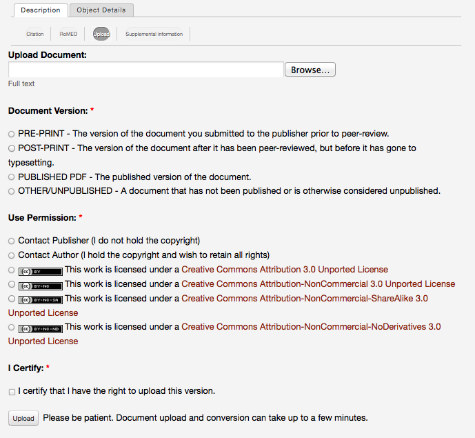 As with the first iteration of IslandScholar, the Robertson Library made the choice to ‘seed’ the repository with the collected citations of scholars at UPEI and encourage researchers to contribute whichever version of the article is permitted by the publishing policy of the journal in which they published. To help scholars decide which version of their work can be legally submitted, IslandScholar V2 also maintained and updated the ability for researchers to review publisher copyright and self-archiving policies by integrating with the Sherpa/Romeo API. Researchers are also permitted in IslandScholar V2 to append any relevant associated research data to a citation by creating a .zip file of relevant materials and appending during the submission process. Figure Twenty-one illustrates the screen that is presented to a scholar appending documents to a citation.