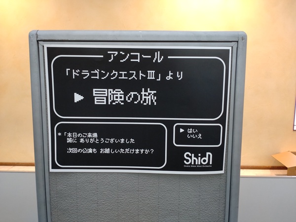 アンコールはなんと『 ドラゴンクエストIII そして伝説へ… 』から「冒険の旅」。指揮者の井田勝大は「母親はエスタークよりも怖かった」と語っていたことから、「ははあ、アンコールは「邪悪なるもの」なのか」と思い込んでいたが・・・ これは嬉しい不意打ちである反面、Ⅳ、Ⅴ、Ⅵをテーマにしたコンサートに選ぶべきではないではとも感じた。なぜなら休憩時間中に2026年1月18日の大津のDQ Ⅰ, Ⅱ, Ⅲのコンサートのチケットを買っていたからだ。まあ、いいか。