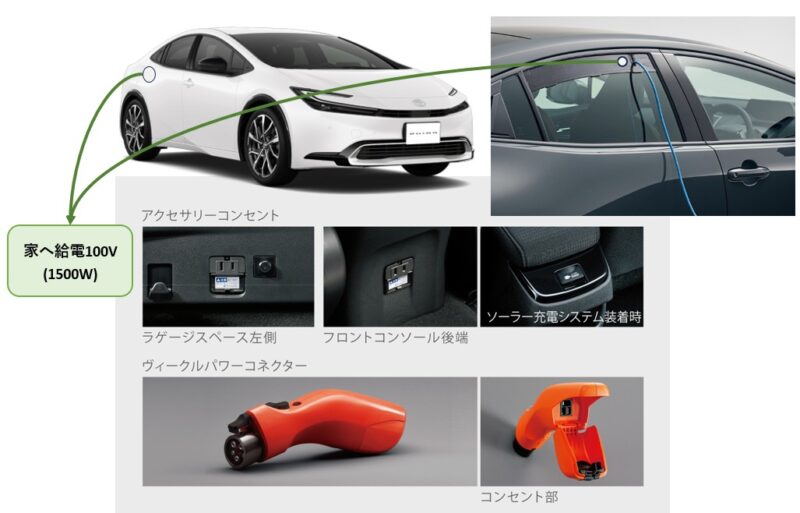 プリウスは、車内2ヵ所からと充電口から100V (1500W)を取り出すことができ、電源を外部へ取り出すのは容易です。