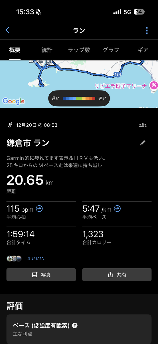Garminのデータを見ても、交感神経優位で「今日は無理しない方がいい日」なのは明らか。ただGarminのデータは無視して脚作りとメンタル強化をテーマに走り切れて良かった。