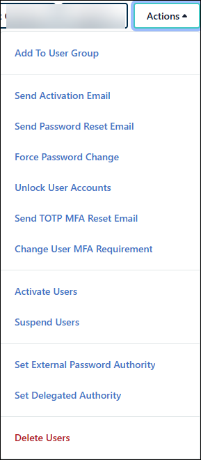The Actions dropdown menu lets you apply actions on single or multiple users from the Users list at once. The Actions menu will be inactive (greyed out) until one or more users are selected from the Users list.