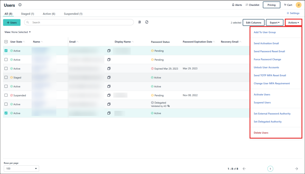 The Actions dropdown menu lets you apply actions on single or multiple users from the users list at once.