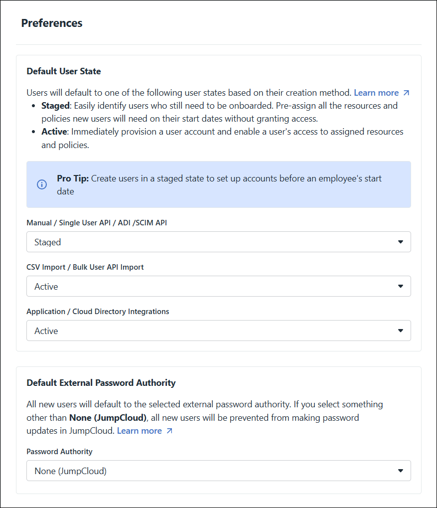 A user state represents where a user is in the identity lifecycle and controls access to JumpCloud provided resources. For more information, see Manage User States.