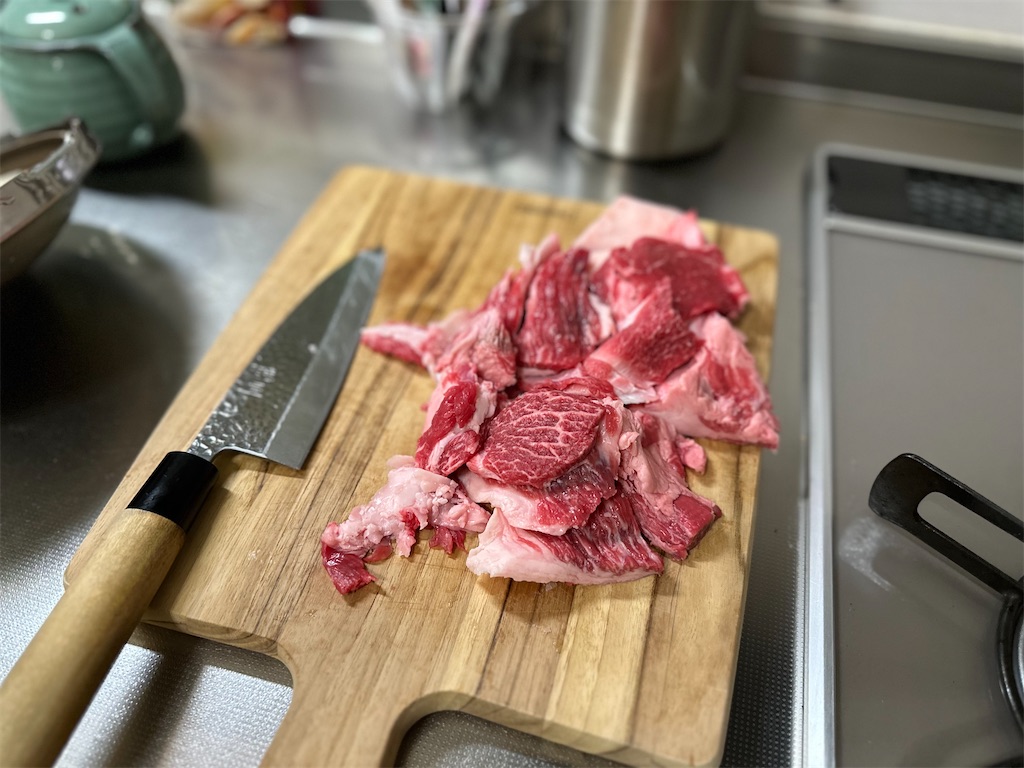 この「牛スジ肉」を一気に圧力を掛けて柔らかく煮込みます。