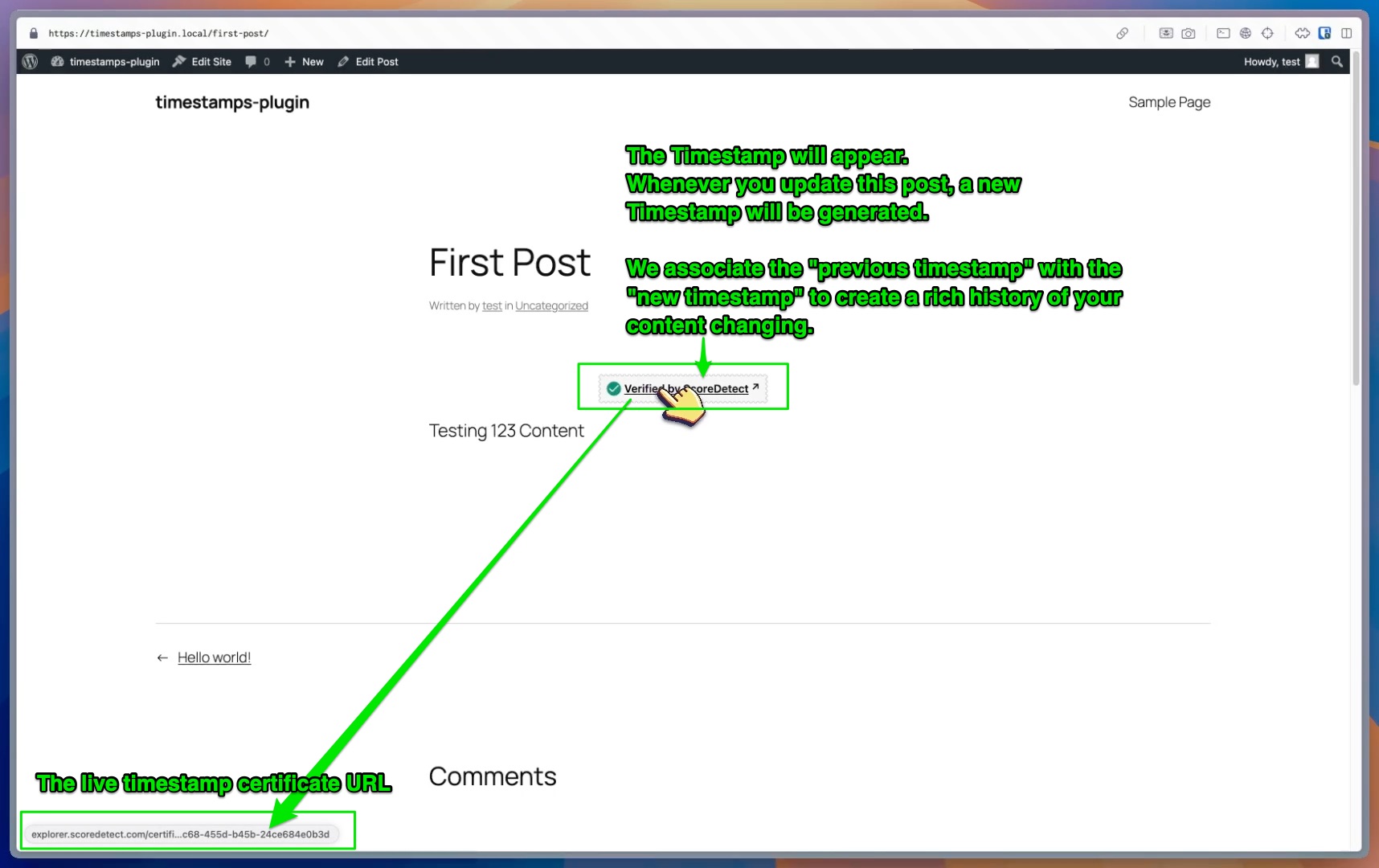 The Timestamp will appear. Whenever you update this post, a new Timestamp will be generated. We associate the “previous timestamp” with the “new timestamp” to create a rich history of your content changing.
