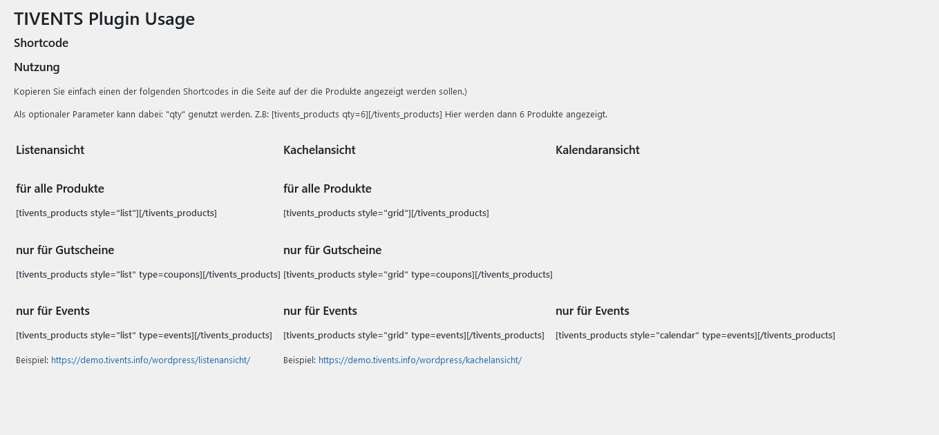 - DE: Es werden keinerlei Daten von Besuchern an TIVENTS übertragen. Der Abruf der Produkte via API erfolgt nur in dem Moment, in der eine Seite mit einem der Shortcodes aufgerufen wird.