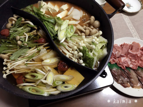 二色鍋で豚キムチ鍋と、さっぱりとした梅しゃぶしゃぶを頂く事に(o^^o)