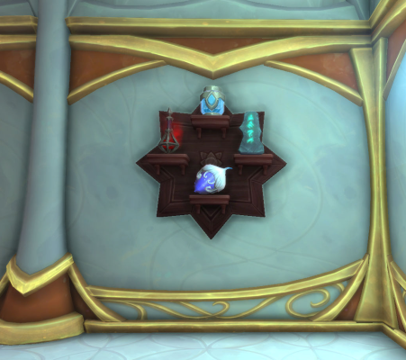 I’d had Bwonsamdi’s Golden Gong and the Monastery Gong on the top shelves of the Empty Lorewalker’s Bookcase in the library. Then I thought maybe I could place them on a Dalaran Display Shelves. Alas, they don’t minaturize small enough to look good on it without also enlarging the shelves. And I missed having them in the library. So I put them back on the Empty Lorewalker’s Bookcase and moved the Preserver’s Censer and Five Dawns Shrine of the Smoking Fish over to the Valdrakken Bookcase.
