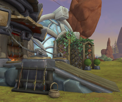 Now that exterior of the Razorwind Shores house is the Silvermoon theme, the Baradin Bay Fishing Rack looked out of place sitting by the front porch, so I moved it inside, next to the fireplace in the front room.