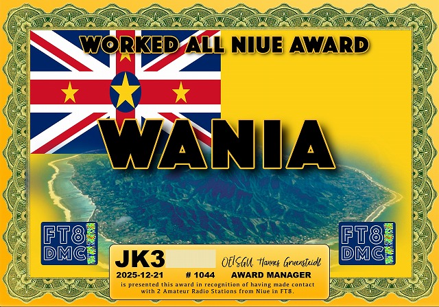 2025年10月8日に E6AD と18MHZ・FT8で交信できて取得。