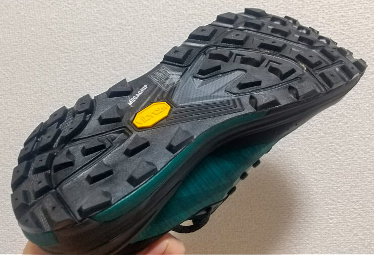 何と言っても、1番の魅力は「Vibram® Megagrip」でしょう!グリップ力抜群で、泥濘が目立つトレイルや滑りやすいロードでもしっかり路面を捉えてくれるため安定感を持って走ることが出来ます!下りが苦手でも安心して足元を預けられると思います(^^)