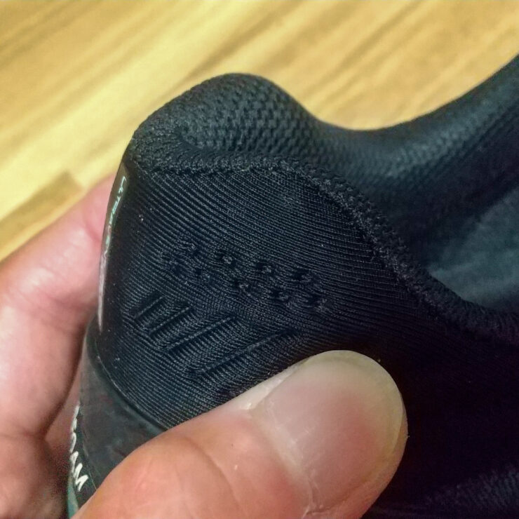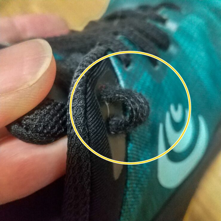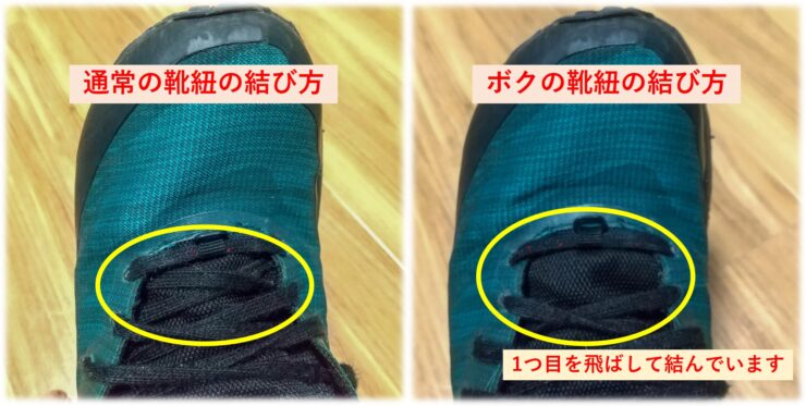 ただ、ボクの足のカタチの都合で、走ると小指のあたりが当たる・擦れる感じがしたので、靴紐の結び方を1コ目のシューホールの通し方を変えて結んでいます。