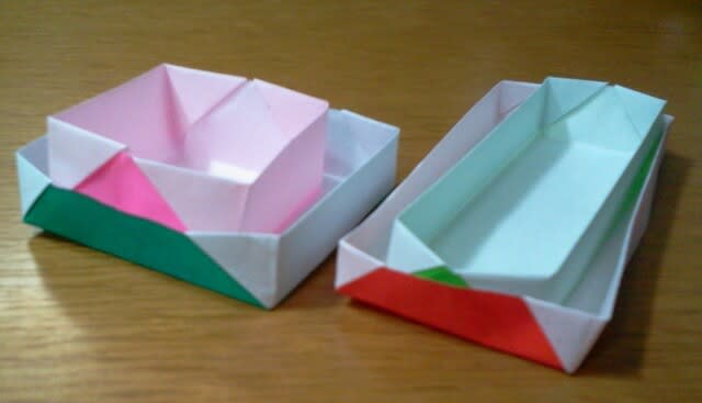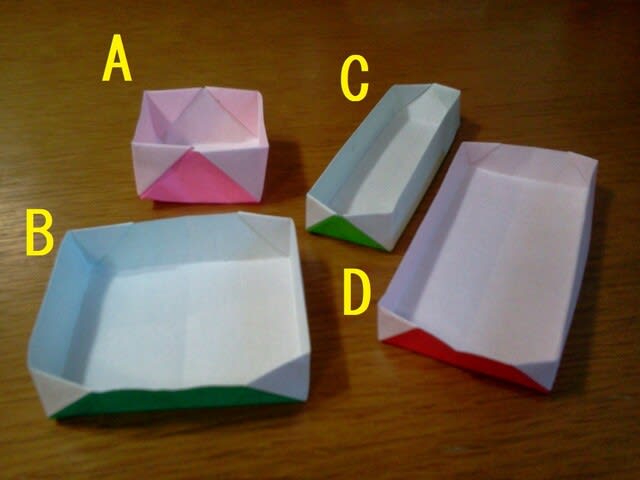 この写真は、A3サイズのチラシで折りました。白い方が今示したAです。その横が“チラシで紙箱づくり”で作ったものです。ほぼ同じ大きさの箱になりました。