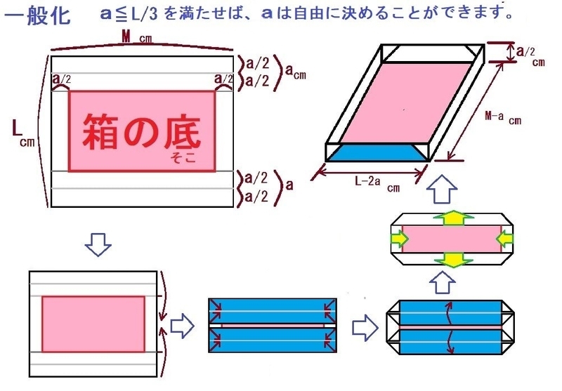 縦=L-2a cm 横=M-a cm 高さ=a/2 cm の紙箱ができます。