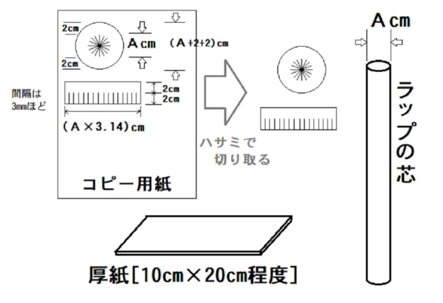 そのコピー用紙部品2つで、底の厚紙とラップの芯を次のようにしてノリで接着します。