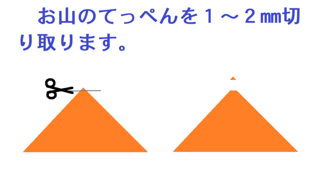 「お山のてっぺん(頂点)を1~2mmハサミで切ってください。」