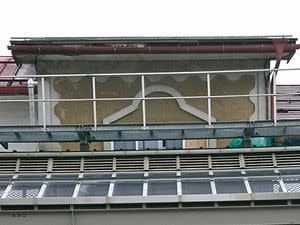 ↓ 自転車に乗りながらアーケードの上を眺めていて(←不審者)目に留まった建物(建築詳細不明)◇。2階の壁面が変わった模様で装飾されている。アーケード敷設以前のものだろうから古いかもしれない。