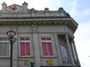 ↓ 筏橋西詰の交差点で圧倒的な存在感を見せる「天狗総本店」(昭和11年・1936・建造)◇。国登録有形文化財に指定されている。”精肉”の文字や天狗の絵は浮き出ているようなのでコテ絵だろうか。オーダー(列柱)のあるバルコニーに立って交差点を見下ろしてみたい。